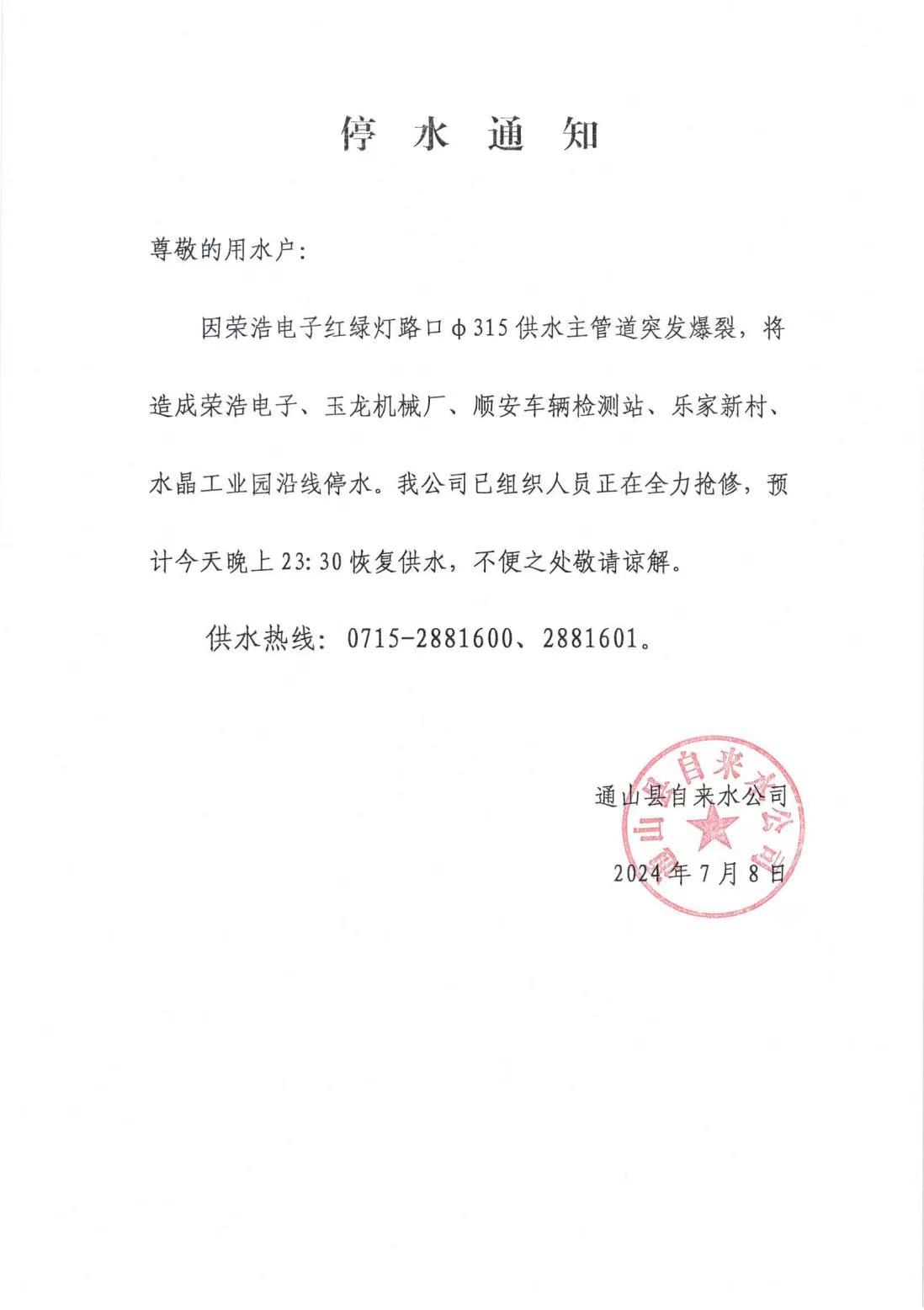 因榮浩電子紅綠燈路口φ315供水主管道突發(fā)爆裂,將造成榮浩電子、玉龍機(jī)械廠、順安車輛檢測(cè)站、樂家新村、水晶工業(yè)園沿線停水。我公司已組織人員正在全力搶修,預(yù)計(jì)今天晚上23:30恢復(fù)供水,不便之處敬請(qǐng)諒解。