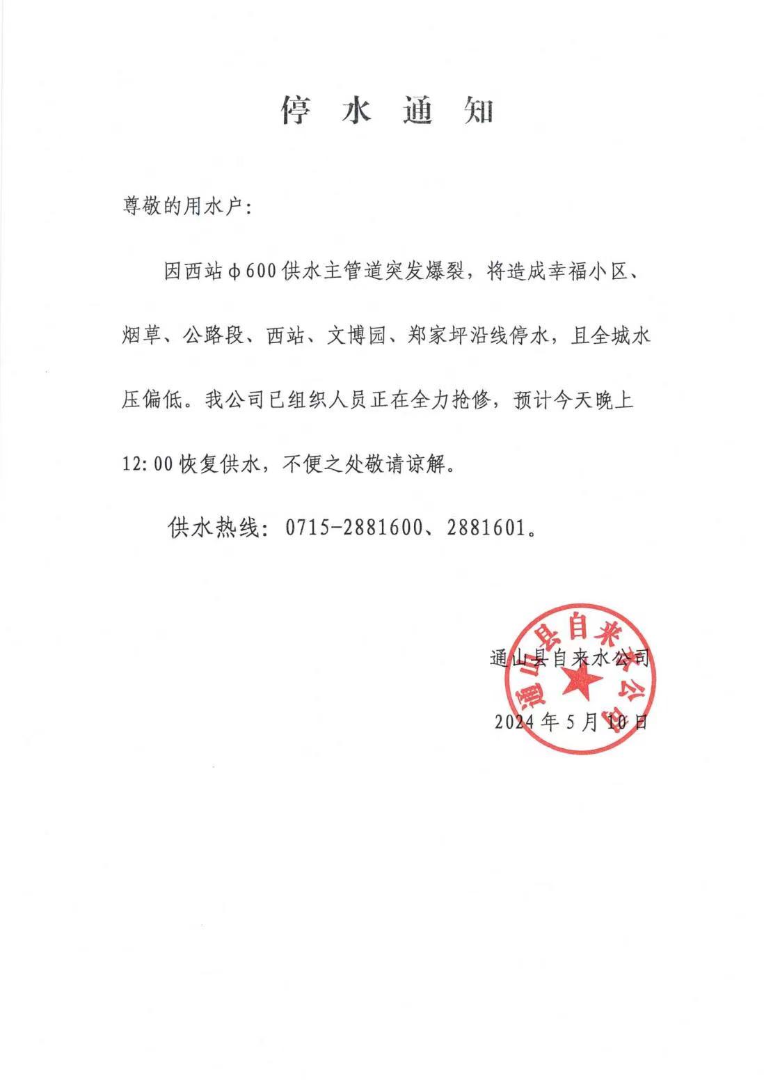 因西站φ600供水主管道突發(fā)爆裂,將造成幸福小區(qū)、煙草、公路段、西站、文博園、鄭家坪沿線停水,且全城水壓偏低。我公司已組織人員正在全力搶修,預(yù)計今天晚上12:00恢復(fù)供水,不便之處敬請諒解。