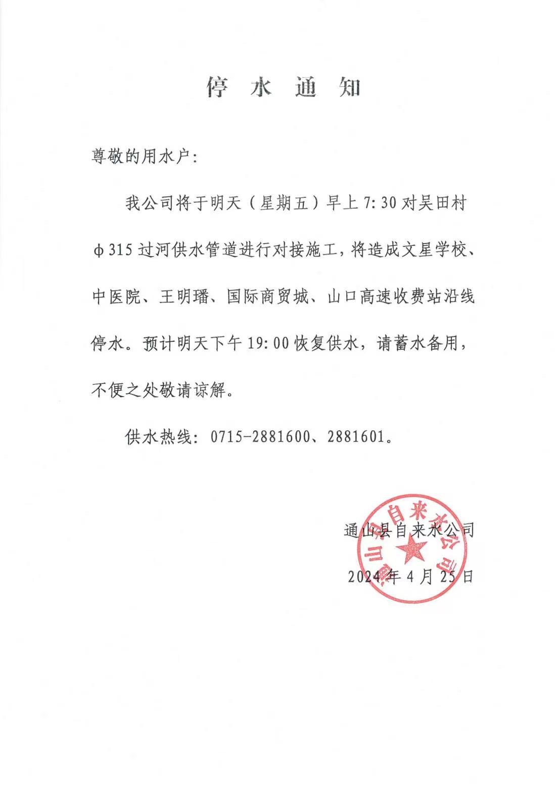 通山縣自來(lái)水公司將于明天(星期五)早上7:30對(duì)吳田村φ315過(guò)河供水管道進(jìn)行對(duì)接施工,將造成文星學(xué)校、中醫(yī)院、王明璠、國(guó)際商貿(mào)城、山口高速收費(fèi)站沿線(xiàn)停水。預(yù)計(jì)明天下午19:00恢復(fù)供水,請(qǐng)蓄水備用,不便之處敬請(qǐng)諒解。